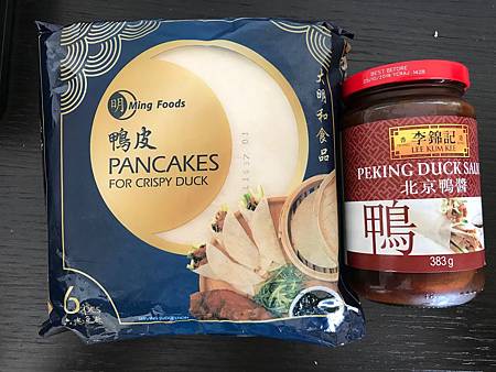 回家後,把北京烤鴨切個薄片、入烤箱烤一下,麵皮一片片乾熱一下,再加個蔥段,擺上桌就跟在餐廳一模一樣,吃在嘴裡,油滋滋的香味,身心都感到撫慰!